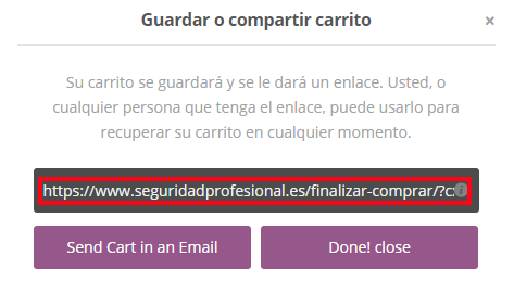 Su carrito se guardará y se le dará un enlace. Usted, o cualquier persona que tenga el enlace, puede usarlo para recuperar su carrito en cualquier momento.