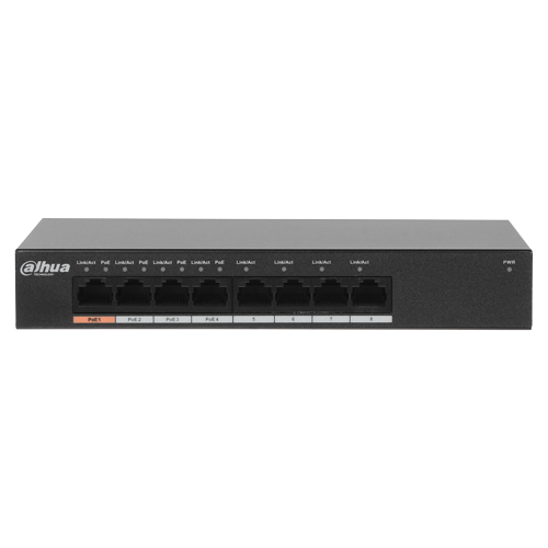 - 8 puertos GigaBit (1 Puerto Hi-PoE + 3 Puertos PoE+/PoE)