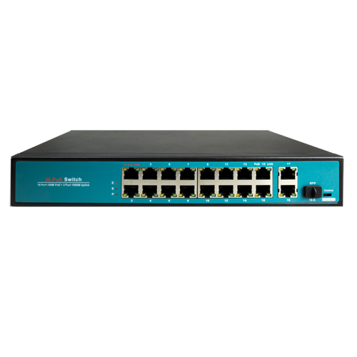 | Interface | 16 puertos PoE RJ45 10/100 Mbps + 2 Uplink Gigabit + 1 SFP Gigabit |